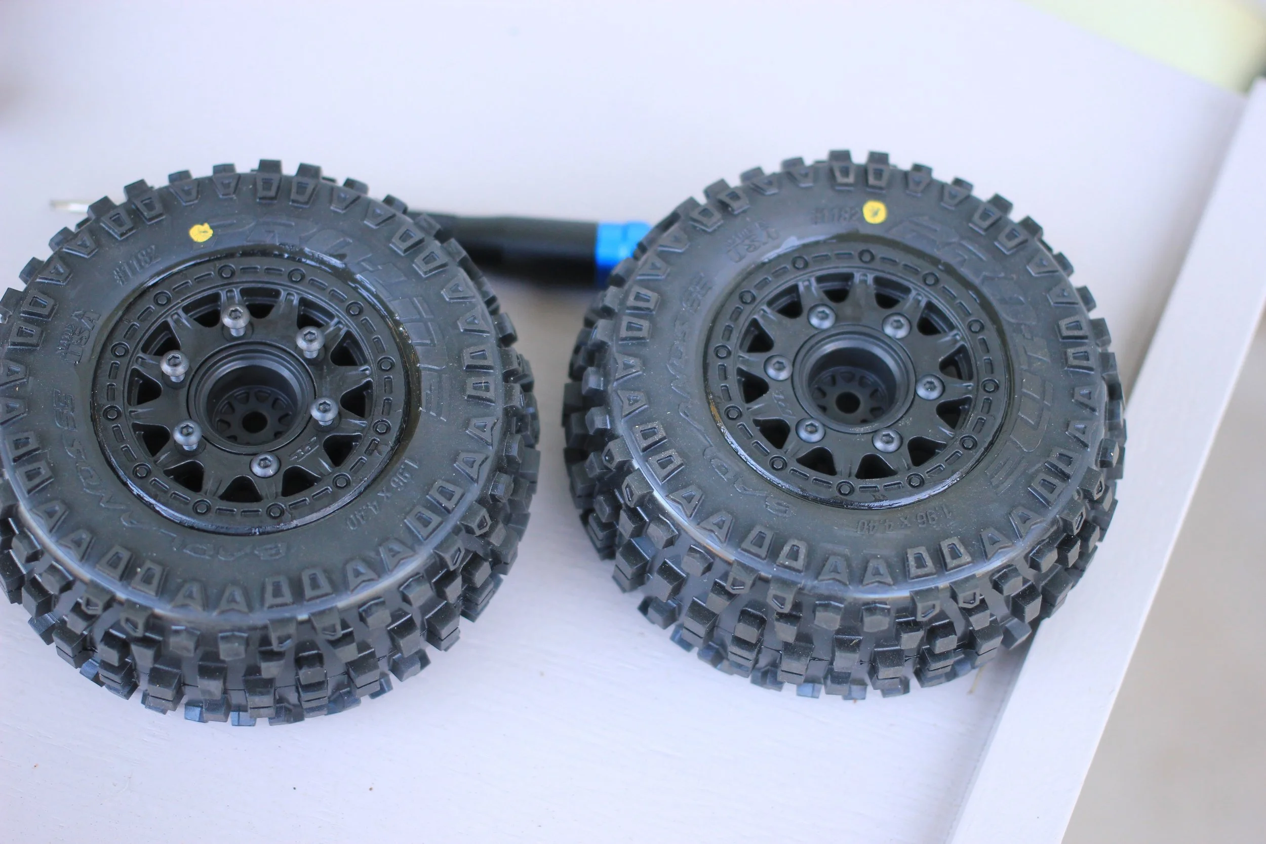 I will cover the tire mounting, wheel assembly, and the like for the Proline tires next week. It is not overly tricky, but it takes a bit of fiddling. The main thing is to make sure you put the screws through the front of the rim to hold the wheel to the hub. I really want to get some driving done on these before I say a yay or a nay.