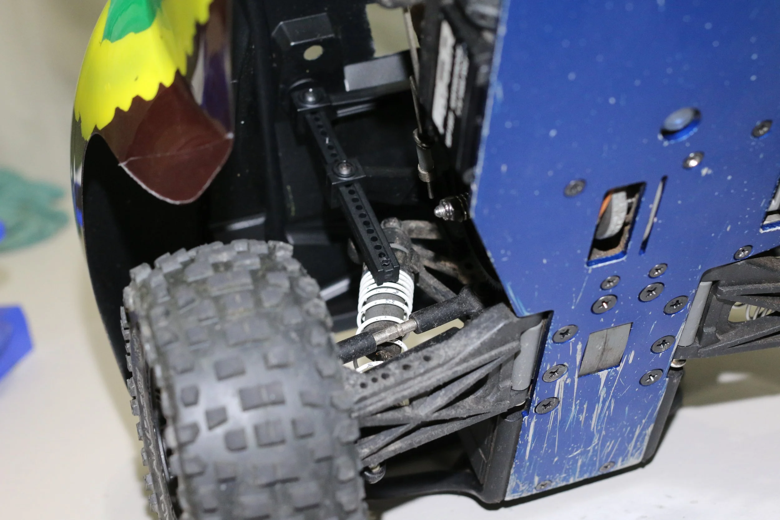 The picture below are the threads poking through the body waiting for the caps. I hear the truck saying, “I want to run… please let me run…” Or I just have an over active imagination. You can see the threads poking through the body below. Yes, I did adjust them before doing a test run. I like being able to pop the little threaded studs through the body. It is pretty quick to take a body on and off.