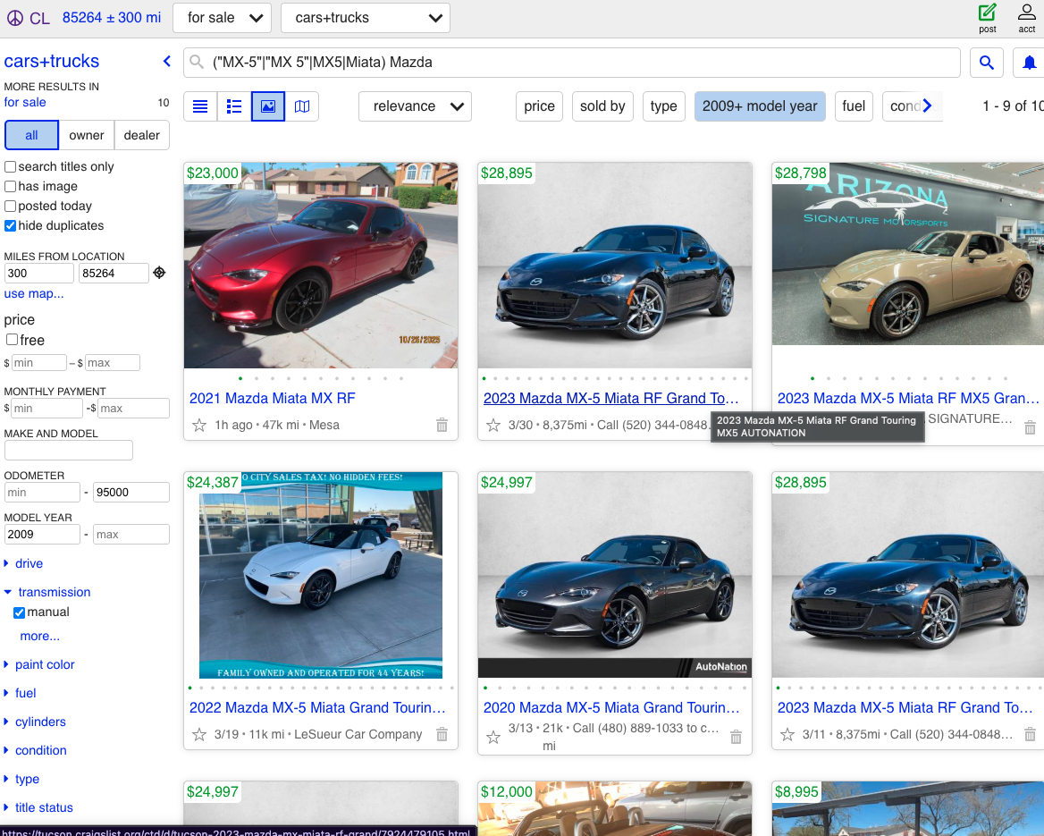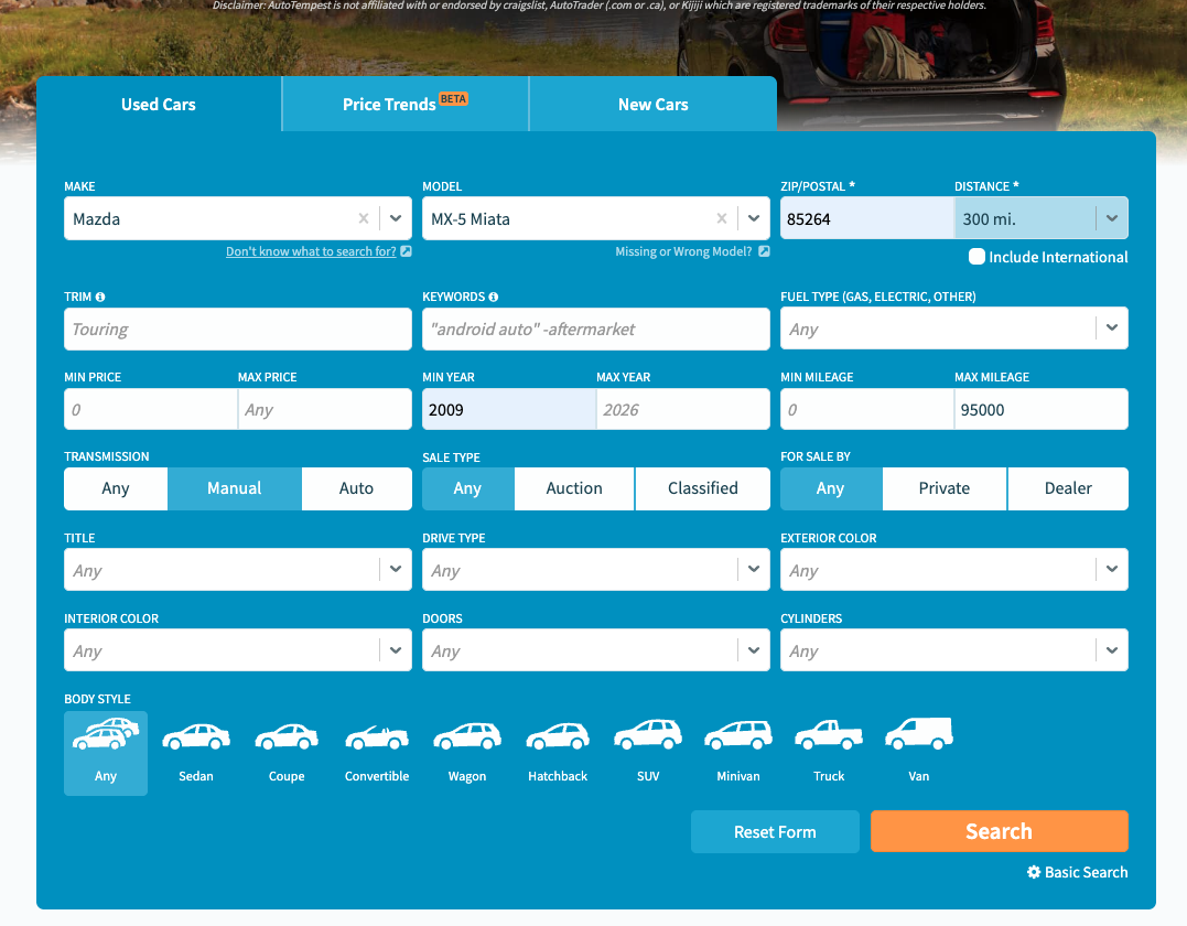 This is amazing because Craigslist is a bit of a bear to set up this kind of search. Craigslist does not do well with saving searches, and this is where I open Auto Tempest to set the search criteria and run it on Craigslist. I like Craigslist because it is where you can find a private seller and skip the dealer. It is always scary to buy a sports car from a dealer. Did the owner autocross it and cook the oil? Well, if you can interview the seller, you get an idea of how they used the car.