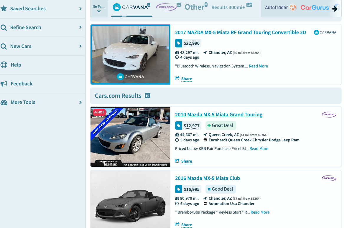 It would be nice to set up a search for multiple vehicles. For instance, one vehicle I am looking for is the twins (Bro-yota 86/GR/BRZ/FRS). AutoTempest makes it so you search for one vehicle at a time. I would like to save a search like in AutoTrader with multiple models. I would like to save a search and call it the BroYota Twins.